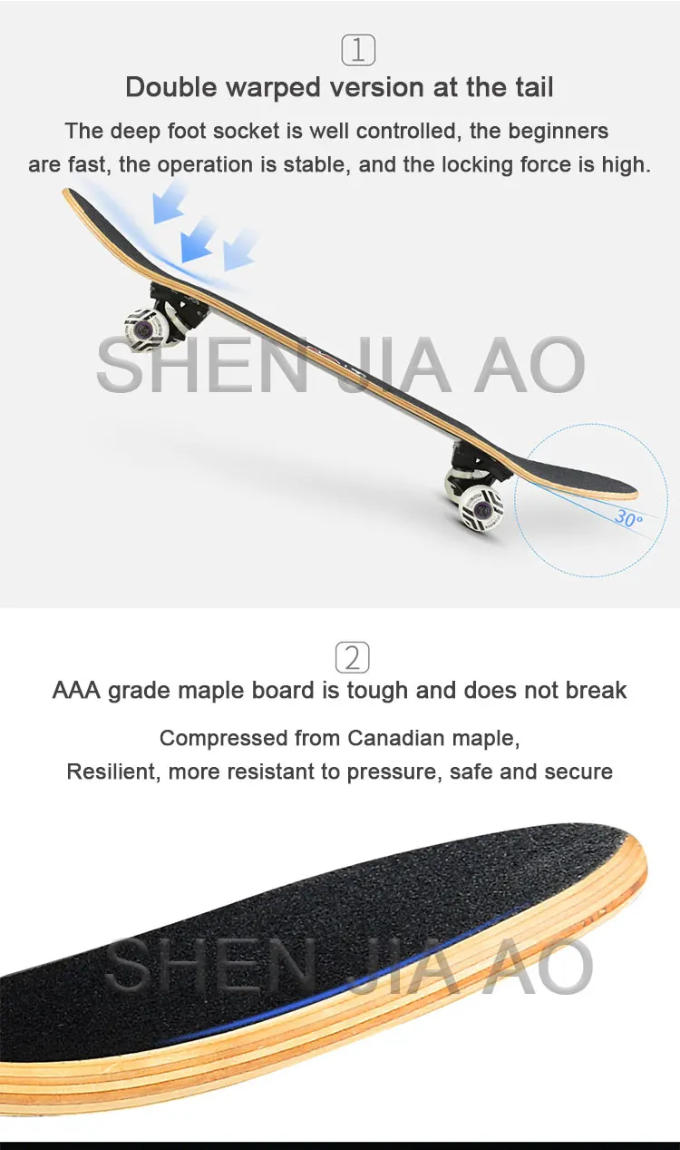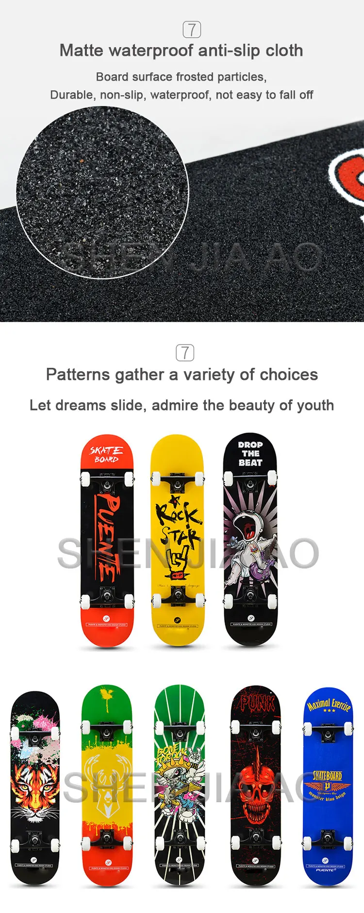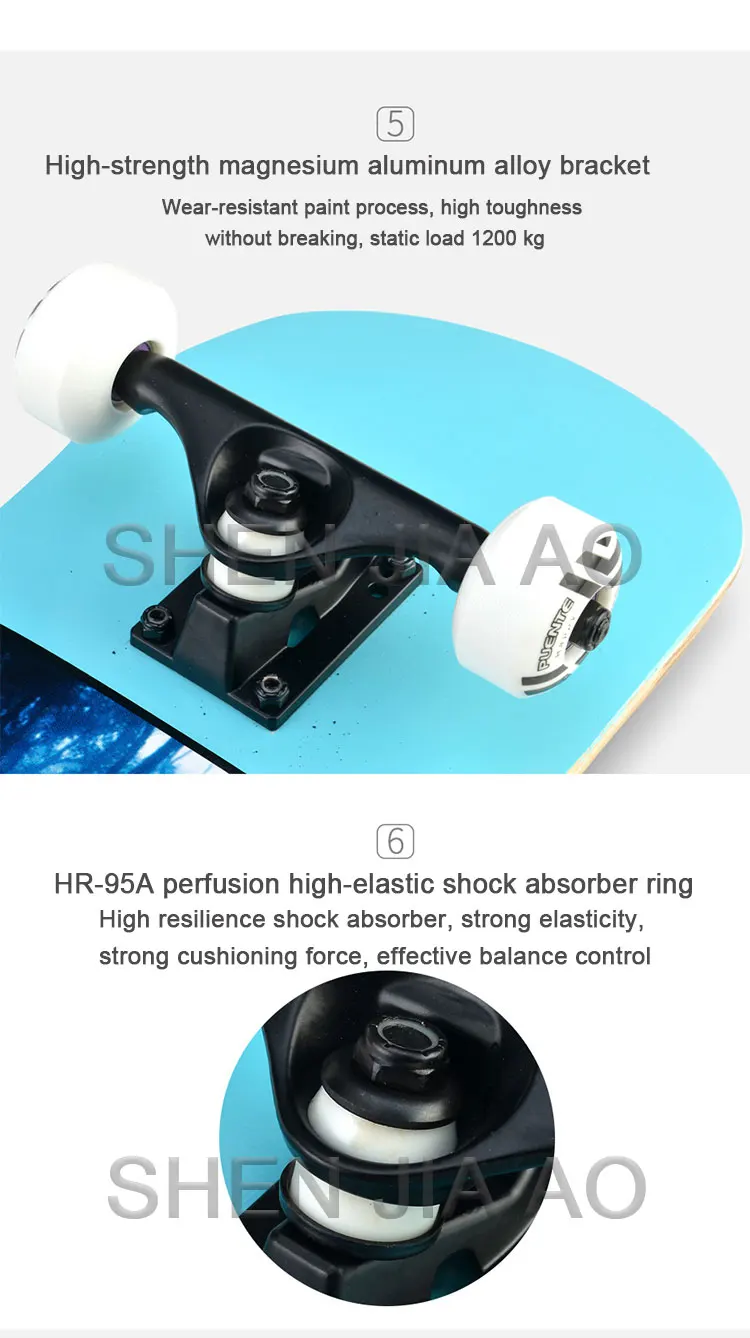Built for reliability, this skateboard supports a maximum load of 200 kg, accommodating both children and adults. The deck surface features a waterproof, anti-slip 80AB cloth with vibrant heat transfer patterns, combining safety with eye-catching aesthetics.