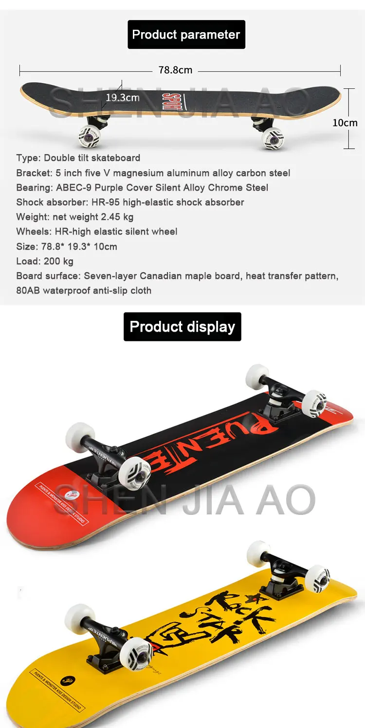 With a compact size of 78.8 × 19.3 × 10 cm and a lightweight design of 2.45 kg, this skateboard is portable, easy to carry, and perfect for travel. Its robust construction ensures long-lasting durability, while the silent wheels and shock absorbers enhance ride quality.