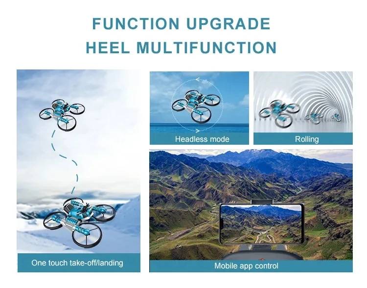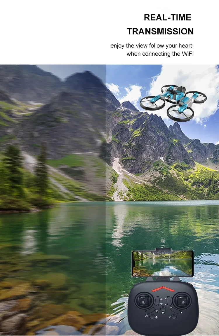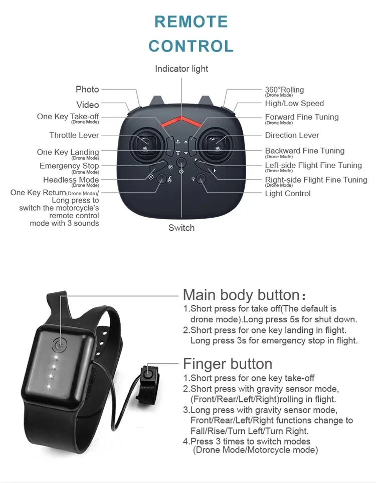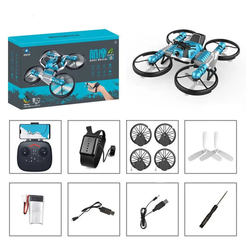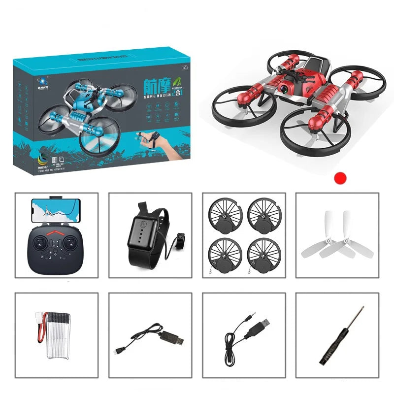 NoEnName_Null D08 2-in-1 Flying Motorcycle Drone with 480P Camera and App Control – Land and Air Deformable RC Quadcopter (CE Certified). Experience the ultimate land and air adventure with the NoEnName_Null D08, a unique 2-in-1 drone and motorcycle hybrid that transforms effortlessly with a one-click deformation system. Drive on land as a motorcycle and soar in the sky as a drone, perfect for beginners, enthusiasts, and advanced users. Capture stunning aerial footage with the built-in 480P HD camera and enjoy multiple control options, including App control, hand gesture control, and optional watch gesture control for selected models. Enjoy easy operation with one-key takeoff and landing, headless mode, auto return, and perform 360° flips and stunt rolls for added excitement. Built with durable ABS plastic and a lightweight 250g body, the D08 is portable, safe, and suitable for indoor and outdoor use. Powered by a 3.7V 500mAh lithium battery, it delivers 6–8 minutes of flight time and recharges in just 40 minutes. Key specifications include 4 control channels, MODE2 controller, 2.4GHz frequency, brushed motor, drone dimensions of 20 × 7 × 20 cm, motorcycle size 17.1 × 9.5 × 7.2 cm, mini drone size 17.1 × 15.1 × 6.6 cm, remote control distance 30 meters, 2-axis gimbal camera mount, anti-wind level 3, and CE certification. The package includes 1 D08 Flying Motorcycle Drone, 1 remote controller, 1 3.7V 500mAh lithium battery, 1 USB charging cable, 1 camera, 1 user manual, and 1 original box. Recommended for ages 6–12 and 14+, the D08 ensures fun, safe, and immersive play. LET MIND FLY — The Future of Land and Air Adventure.